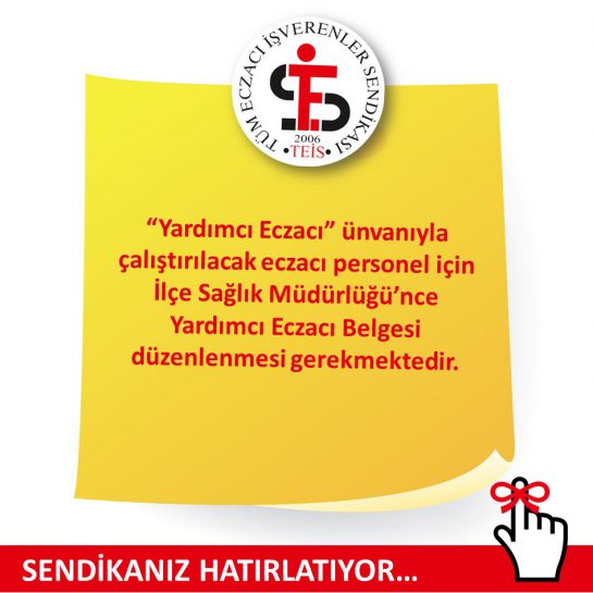 Tüm Eczacı İşverenler Sendikası (TEİS), ’’Yardımcı Eczacı Çalıştırılması’’ na ve ’’Yardımcı Eczacı Atanması’’ için gereken işlemlere ilişkin bir açıklama yayımladı.