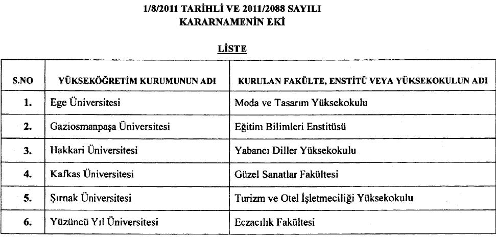 Ekli listede yer alan fakülte, enstitü ve yüksekokulların karşılarında belirtilen yükseköğretim kurumlarına bağlı olarak kurulması; Millî Eğitim Bakanlığının teklif yazıları üzerine, 28/3/1983 tarihli ve 2809 sayılı Kanunun ek 30 uncu maddesine göre, Bakanlar Kurulu’nca 1/8/2011 tarihinde kararlaştırılmıştır.