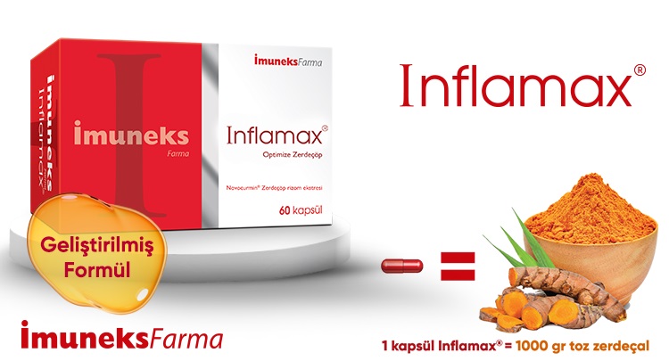 Geliştirilmiş Yeni Formuyla İmuneks Farma Inflamax Optimize Zerdeçöp Novocurmin® Zerdeçöp rizom ekstresi içerir. 1 Kapsül Inflamax = 1000 gram Toz Zerdeçal Takviye Edici Gıdadır. İlaç değildir. Yalnızca eczanelerde satılır, Her bir kutu 60 kapsül içerir.