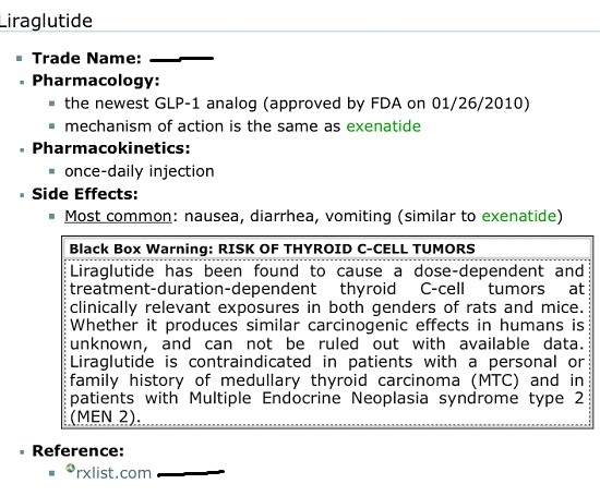 Exenatide ve Liraglutide etken maddeli ilaçlara FDA tarafında C hücreli tiroid kanseri riskini artırması dolayısı ile prospektüslerine kara kutu uyarısı koyulmustur. Araştırmalar devam etmektedir.