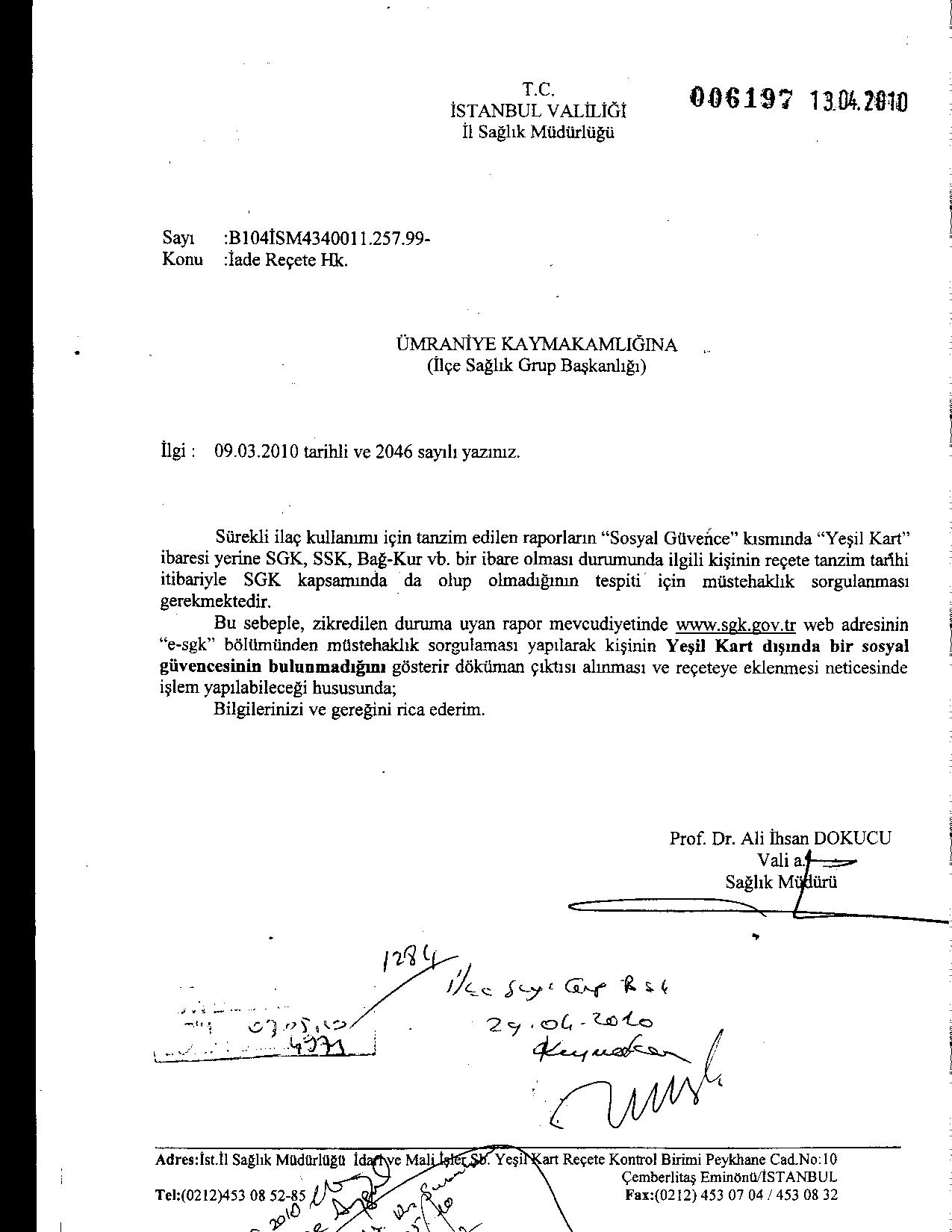 Daha önce SSK, BağKur vb. giibi güvencesi olup daha sonra Yeşil Kart alan hastaların eski raporlarında kurumunun Yeşil Kart olarak belirtilmediği gerekçesi ile Sağlık Grup Başkanları ile Eczacılar arasında yaşanan sıkıntıya açıklık getirildi. İstanbul İl Sağlık Müdürlüğü'nün Sağlık Grup Başkanlıklarına gönderdiği yazı aşağıdadır.