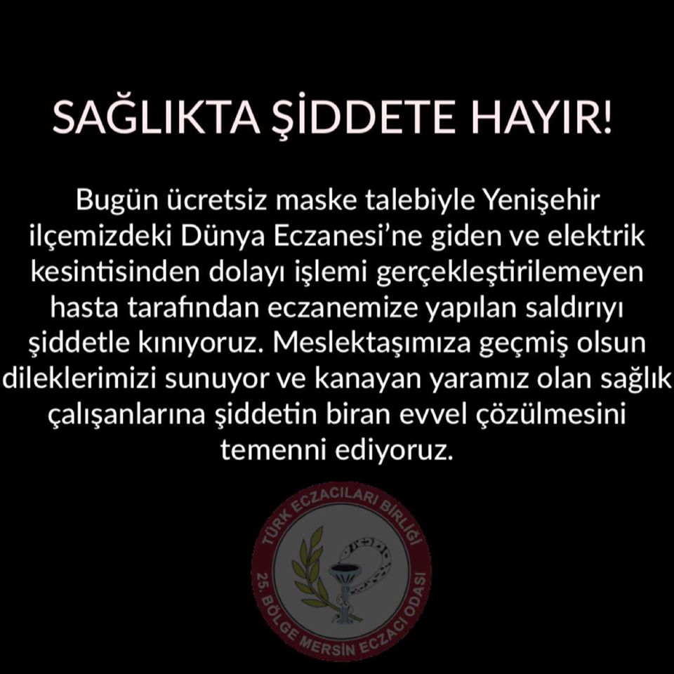 Yenişehir ilçemizde faaliyet gösteren Dünya Eczanesi, bugün (03.06.2020) elektrik kesintisi sebebiyle maske dağıtımı yapamadığından dolayı saldırıya uğradı.
