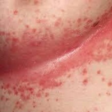 İntertrigo (Kaba etlerin arasında kalan bölge, skrotum ve uyluk arasında birbirine temas eden yüzeyler, kadında memelerin sarkan kısımlarının altında kalan alanlar gibi vücutta derinin kıvrım yaptığı veya birbirine temas ettiği yerlerde görülen derinin deriye sürtünmesinden kaynaklanan dermatit. Ter birikimi, nem, sıcaklık ve yerleşik floradaki mikroorganizmaların üremesi sonucu ortaya çıkar.)